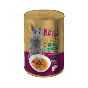 مشخصات کنسرو چانک گربه رویال کوکو Royal Coco Beef Chunks طعم بیف در سس جگر بافت تکه ای وزن 380 گرم
